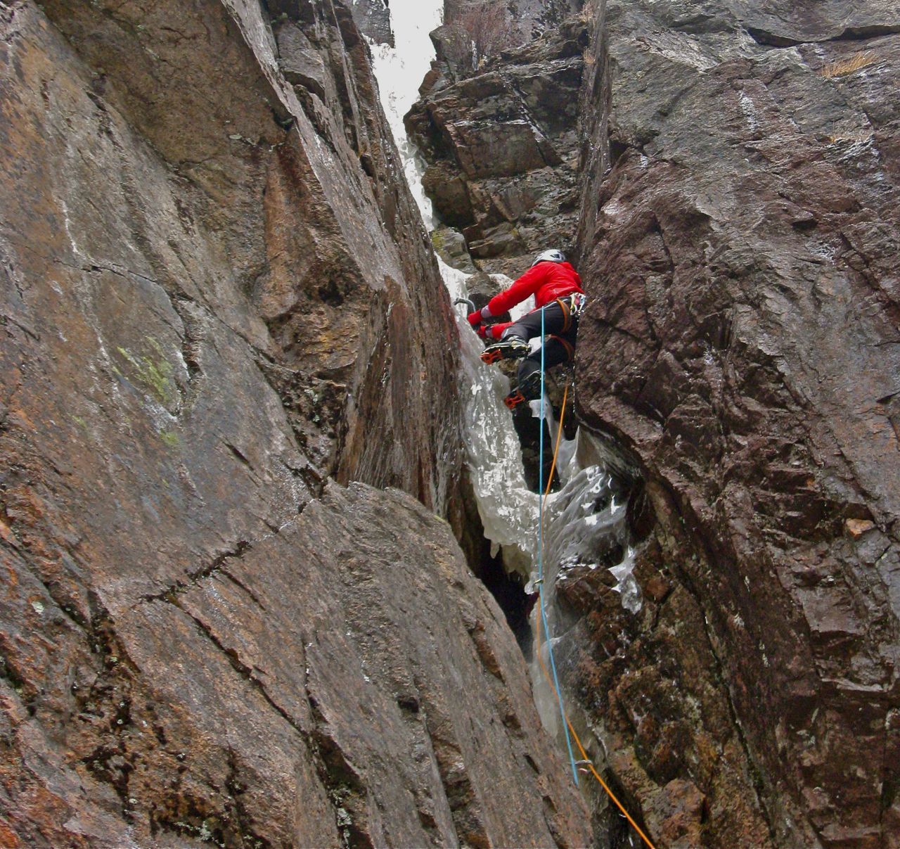 The Advocate, WI5, a tannin-stained and intimidating 100′ tall dead-vertical pillar is easily as long as the vertical cruxes on routes like Called on Account of Rains and The Promenade, which are typically rated WI5+.
